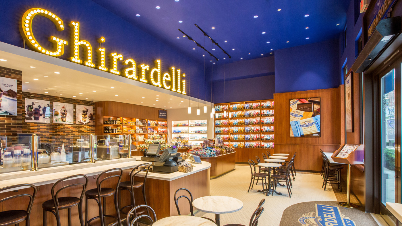 These design moves—the interior light bulb sign, the creamy white “box within a box,” the coffee espresso wall tile, and the Ghirardelli blue ceiling—are now part of Ghirardelli’s new store branding and incorporated into new stores following Vegas, including the newest store at Boston’s Faneuil Hall, which we designed and which opened in late October, and the forthcoming store we’re creating for Ghirardelli in Chicago’s Wrigley Building.