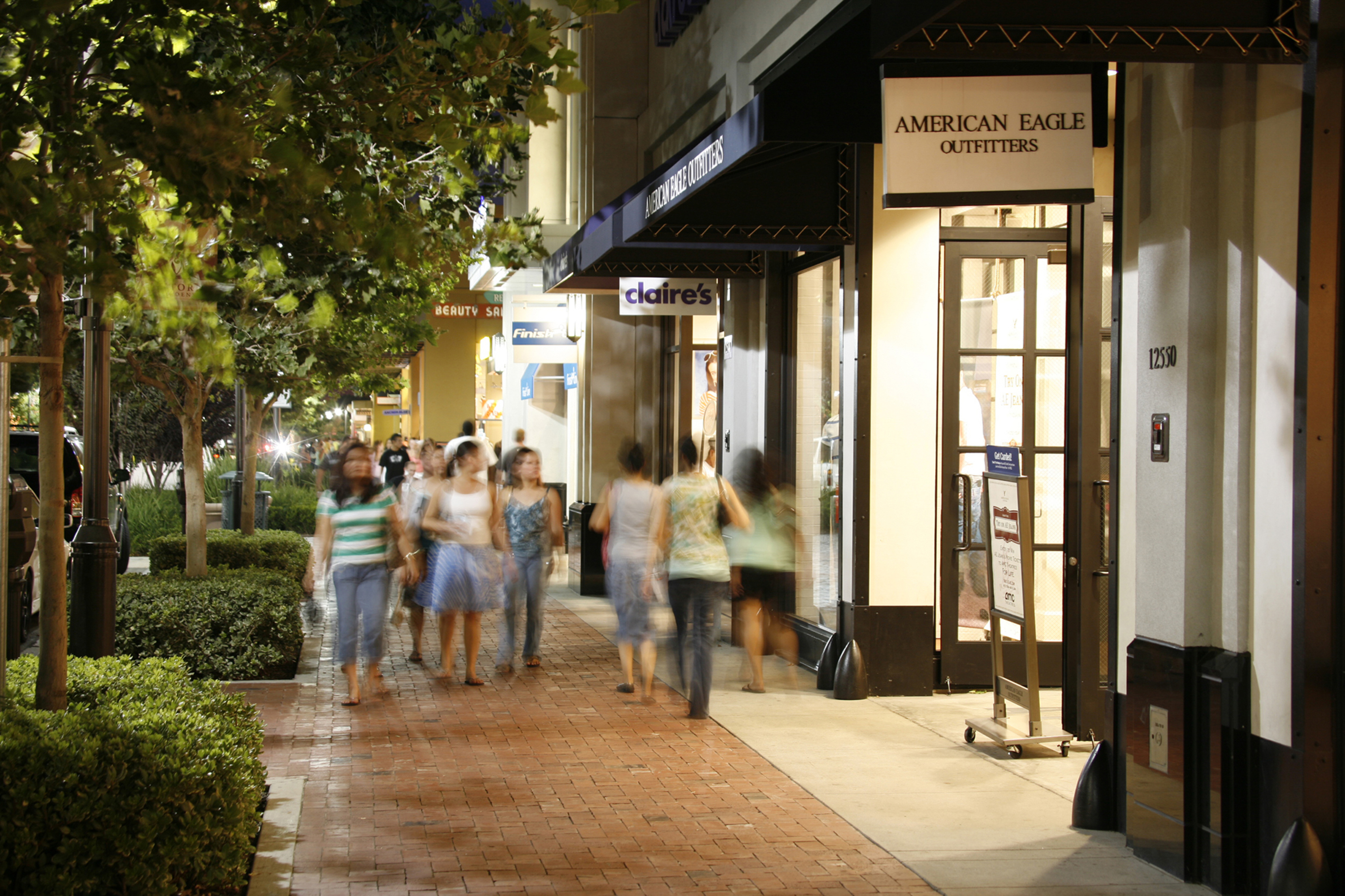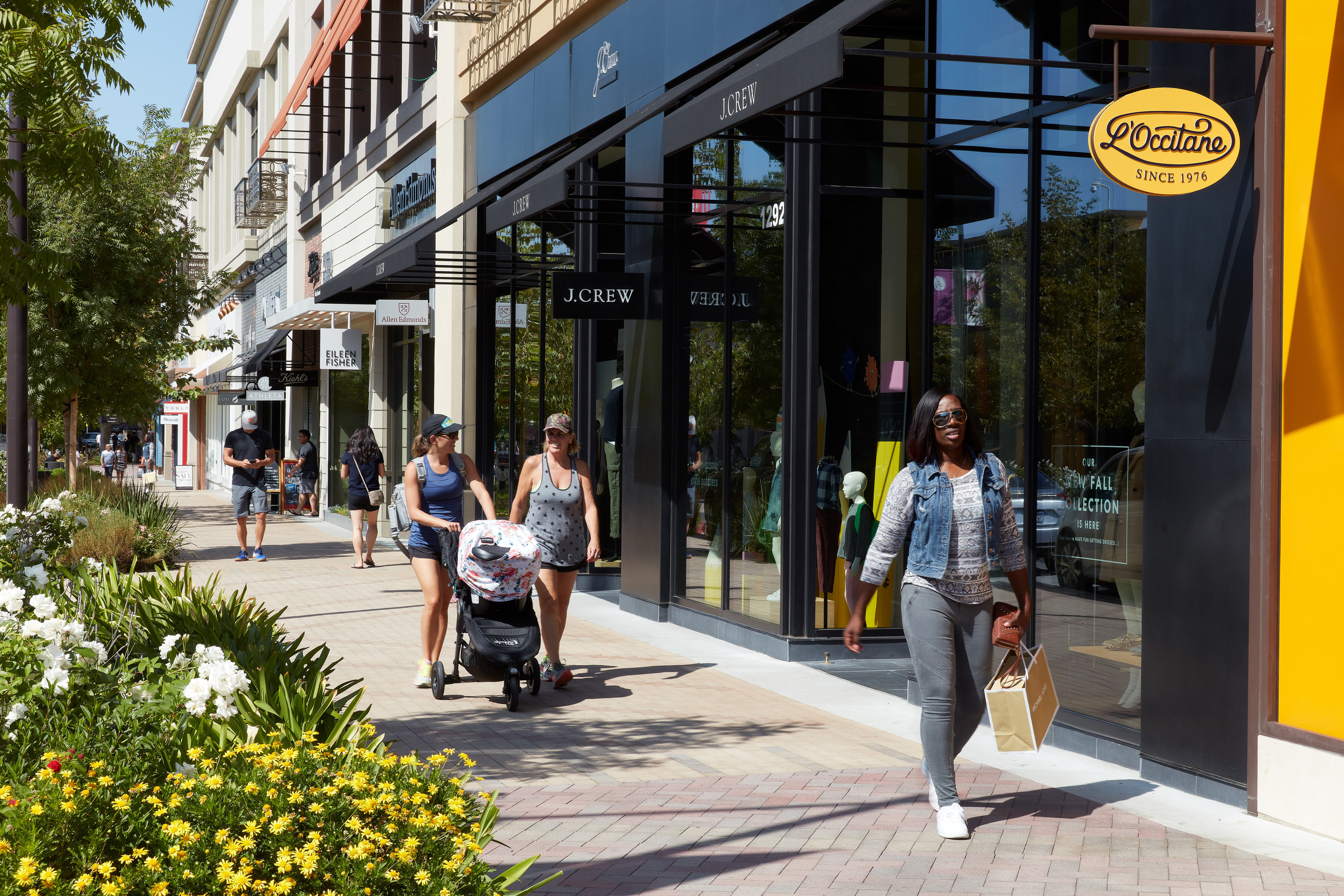 Shoppers enjoying a leisurely stroll at Broadway Plaza, Walnut Creek, CA. Textures, landscaping, generous sidewalks and storefront displays all have a calming effect on the customer’s pace and allow for ample social distancing. (Image credit: Phil Bond)