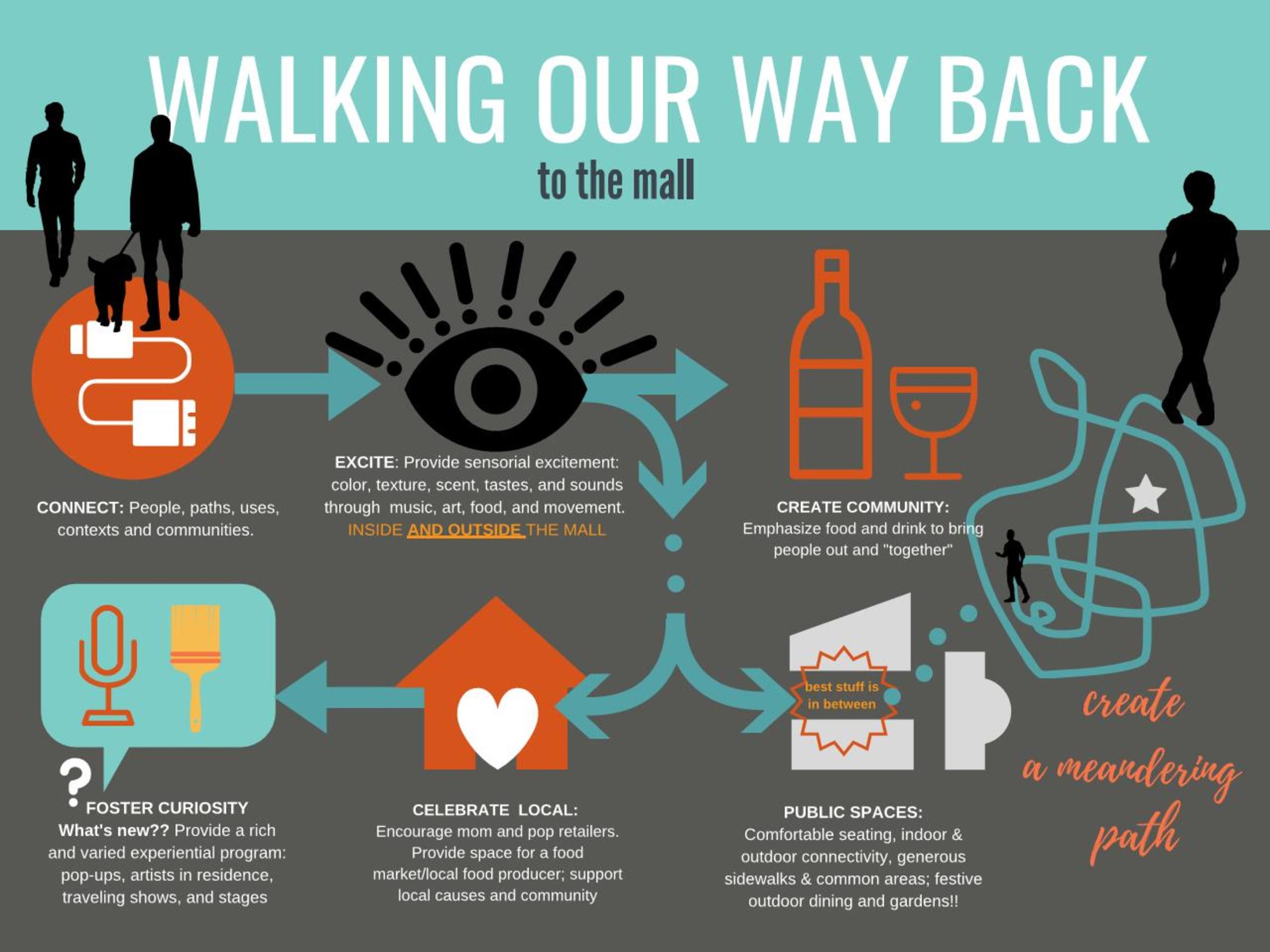 What makes for a memorable walking experience? A mix of familiarity with a dash of the unexpected; opportunities for social interaction and conversation; visual richness and variety; a variety of spatial scales, from grand to intimate; a textured visual environment; enticing food aromas; the gathering of different communities (residential, office), and of course people, people, people. All these elements can combine to create an anticipatory release of dopamine when the customer thinks about a visit to the mall, and all of these experiences can be provided safely and with appropriate distancing.