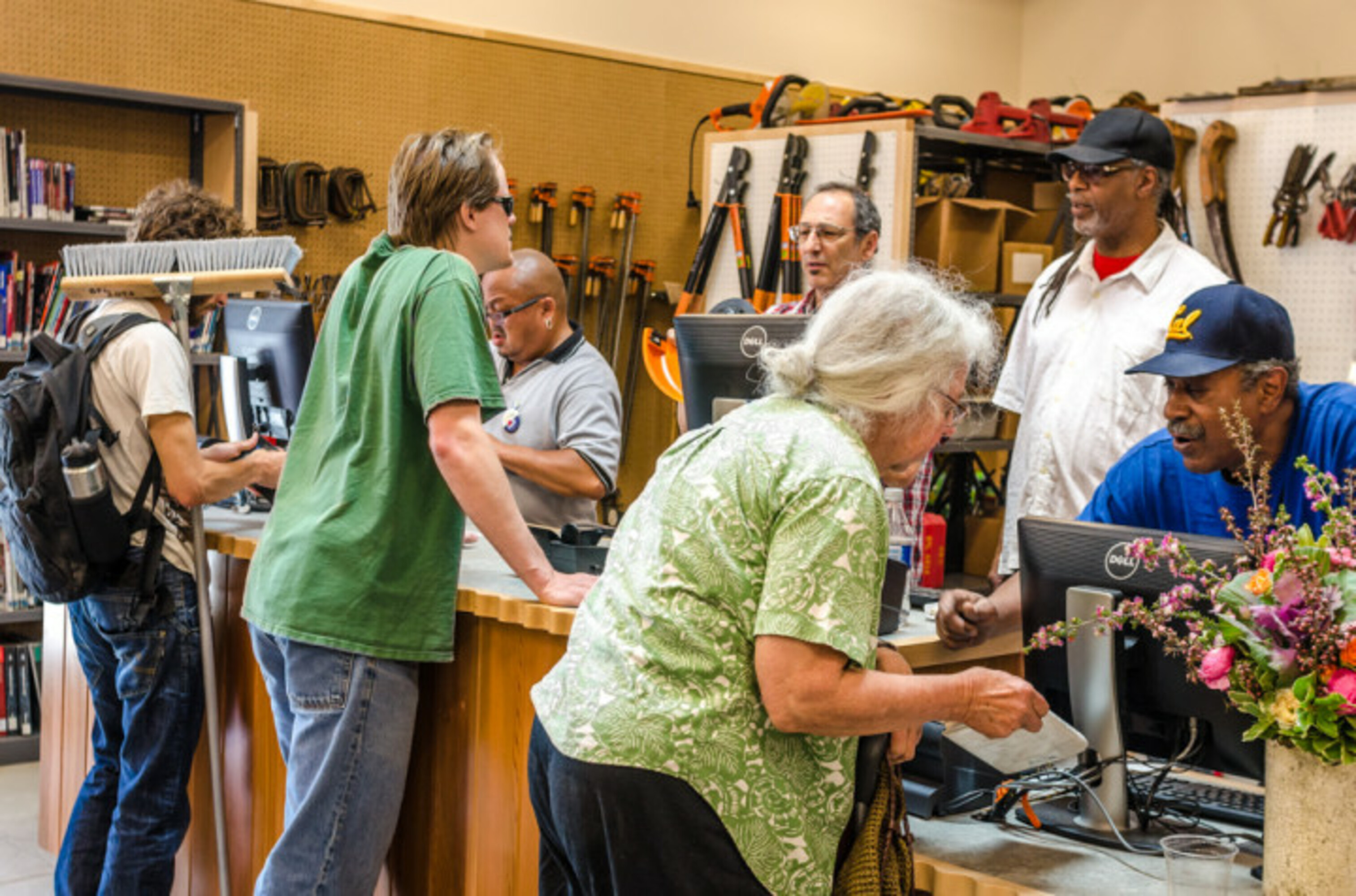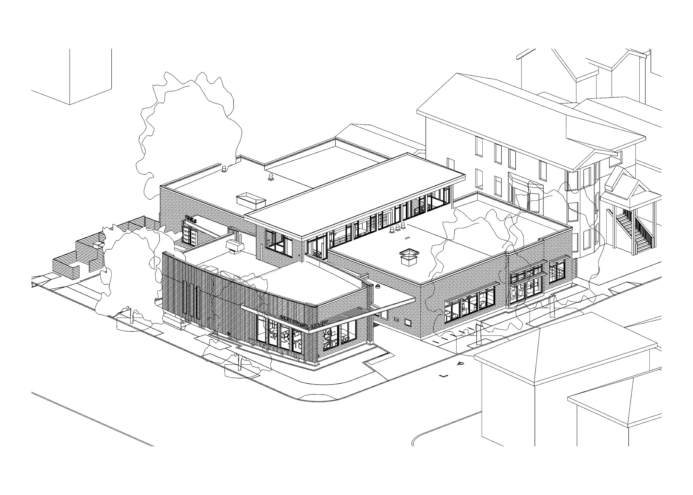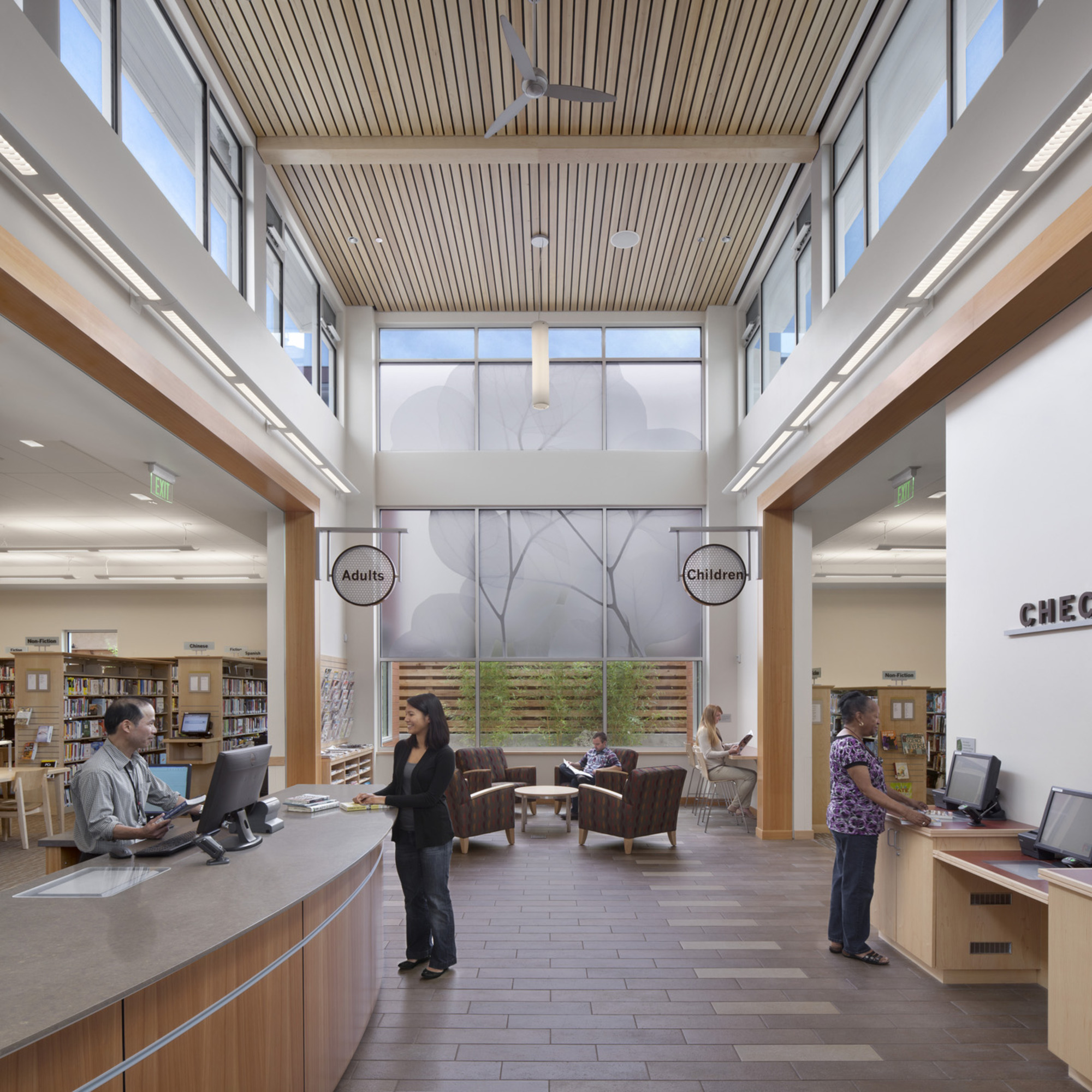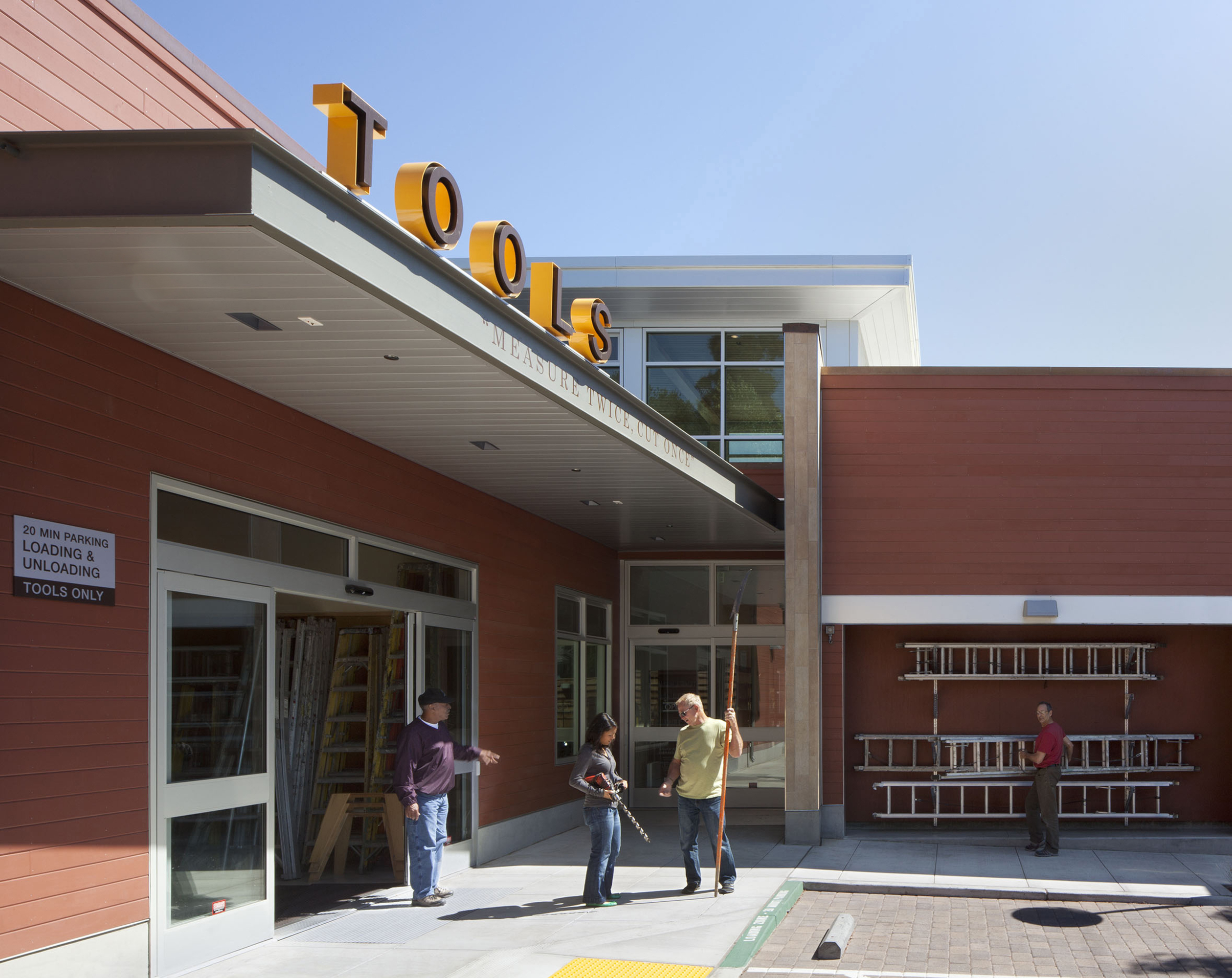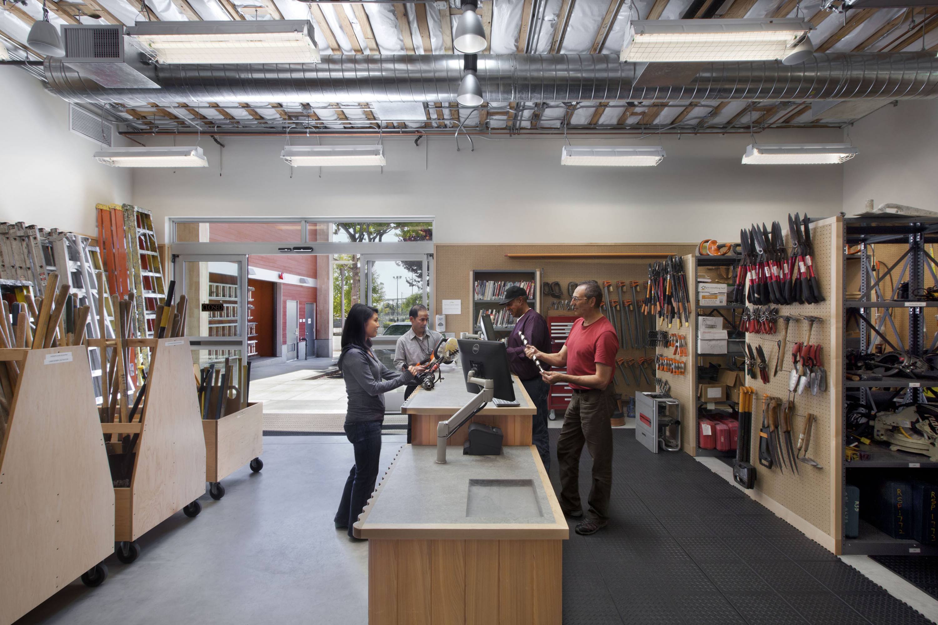 The maker movement is thriving in Berkeley! One of the unique features of the new South Branch Library is the tool lending library, a beloved community feature which started in a trailer on this site in 1979. Whereas the former library turned inward, the new branch opens out to the street and adds 50% more usable space.  At the core, a 20-foot tall, linear browsing room shares daylight and natural cooling with all three reading rooms - adults, children and teens. The tool library, always a busy place, occupies a separate section of the building for ease of access and to minimize disruption to the quieter browsing room.