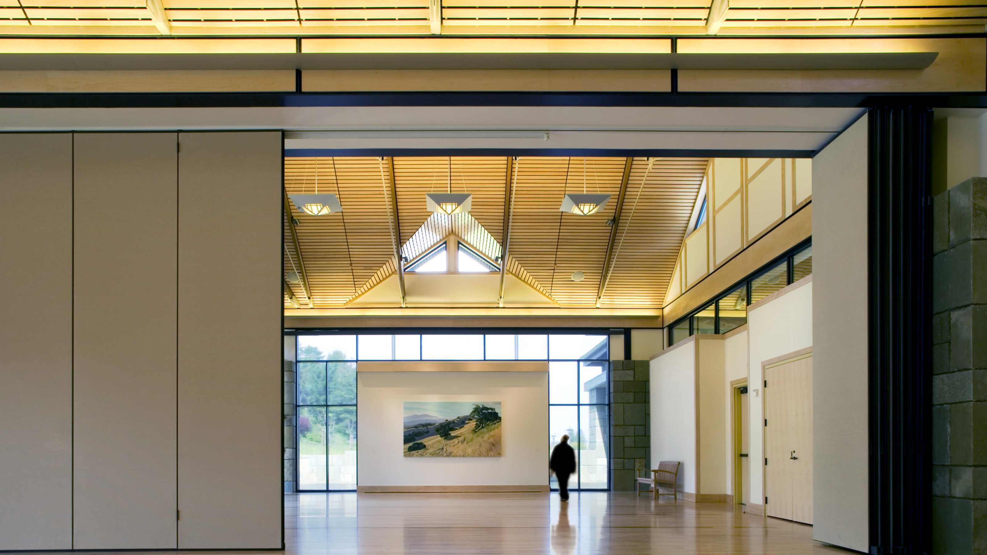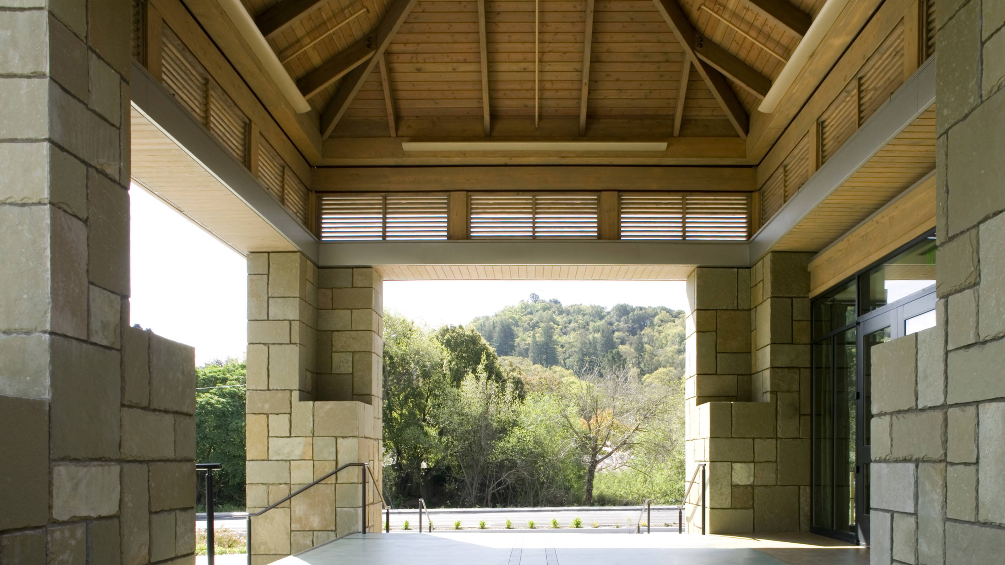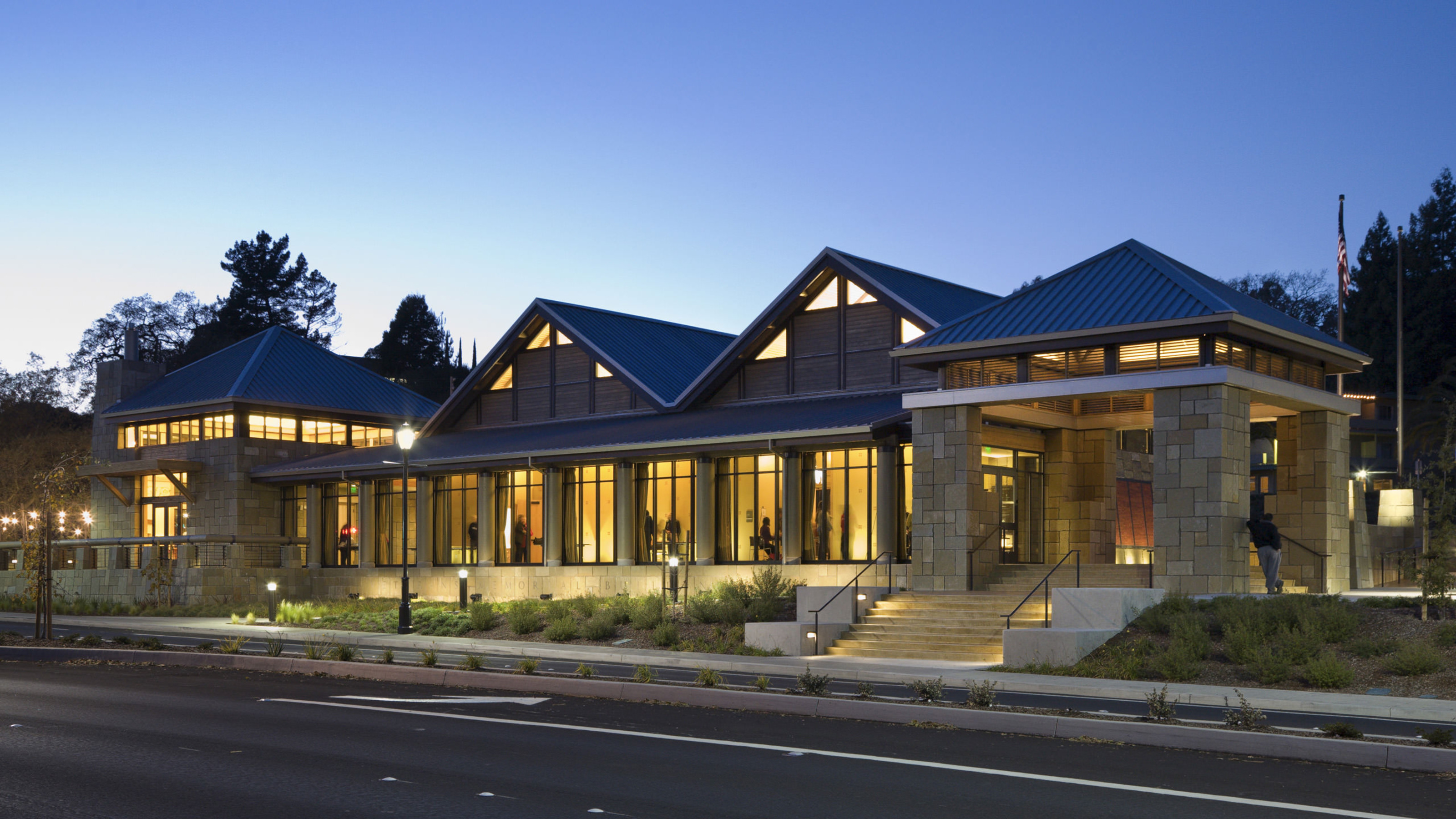 Commissioned by the City of Lafayette, the 9,500 SF Veterans Memorial is sited on a narrow strip of land with a linear entrance colonnade facing onto busy Mt. Diablo Boulevard. Behind, twin social halls can open into one large event space with views to the east bay hills. Alaskan cedar columns and hemlock slat ceilings convey the sense of an arts and crafts lodge appropriate to the use and setting. The building was a recipient of the Helen Putnam Award for Excellence in Effective Advocacy, Intergovernmental Relations and Regional Cooperation in 2005.