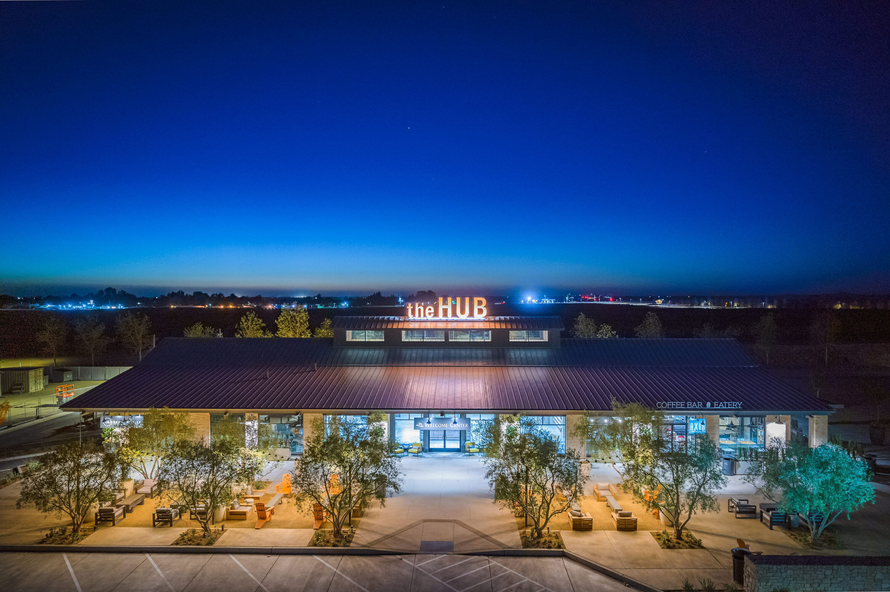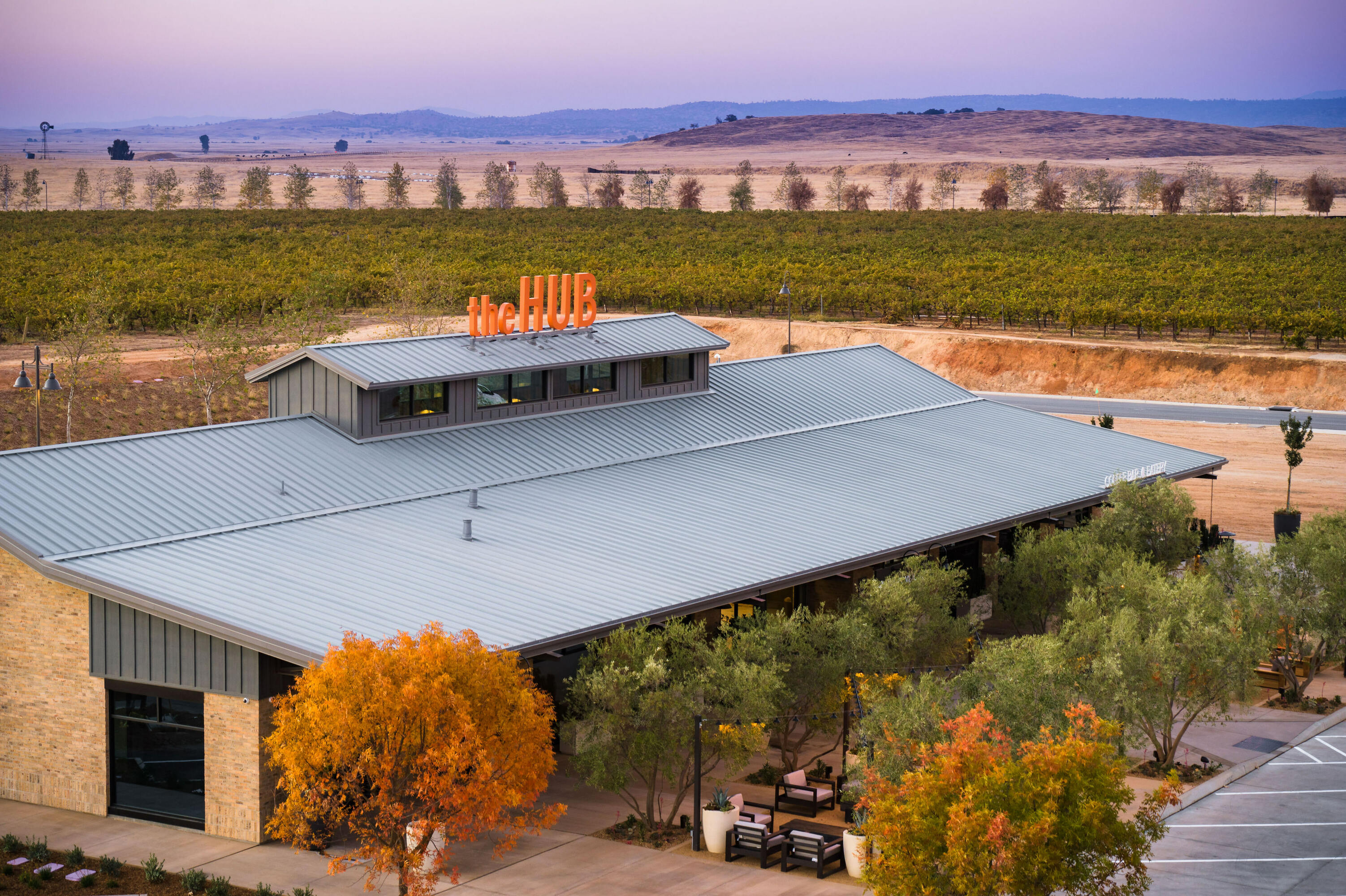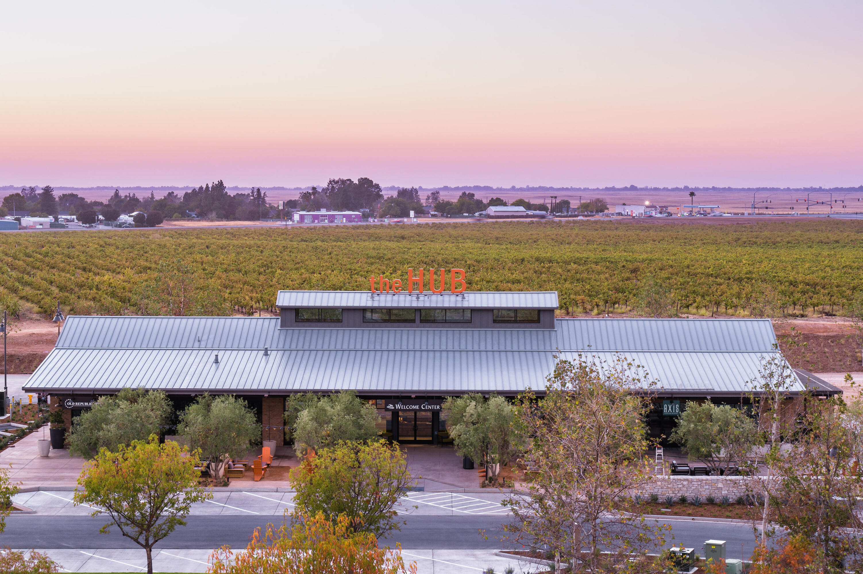 The Hub, the Axis Coffee Shop and Eatery and a Madera County Fire Station form part of the first phase of the town center of this new family-oriented master-planned community. Inspired by the rich agricultural tradition of the region, the building design is based on an imagined history of the site as it could have evolved over time, from a simple farmstead to a large Hacienda that would have eventually been converted into its present use.  Large roof overhangs create shady and inviting places to sit and enjoy a cup of coffee or a simple breakfast or lunch.  The Hub also acts as the Welcome Center for the community, featuring exhibits that illustrate the history of the region and the details of the masterplan, and includes a small office suite.  Inside the building, large exposed metal trusses and a roof skylight reinforce the barn-like feel of the space. The Hub and Axis Coffee Shop and adjacent Fire Station will eventually grow into a multi-block town center that will form the commercial heart and soul of this community.