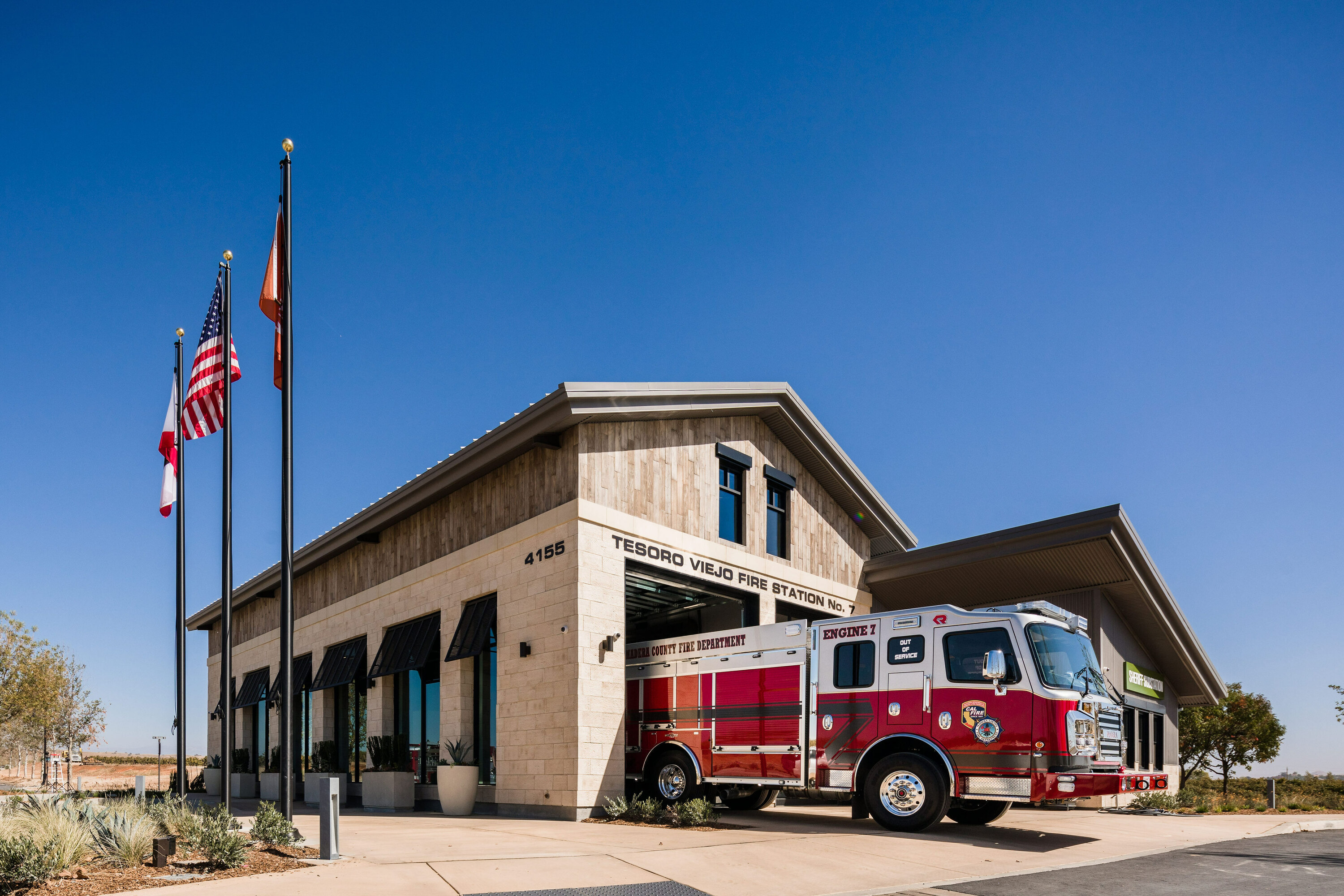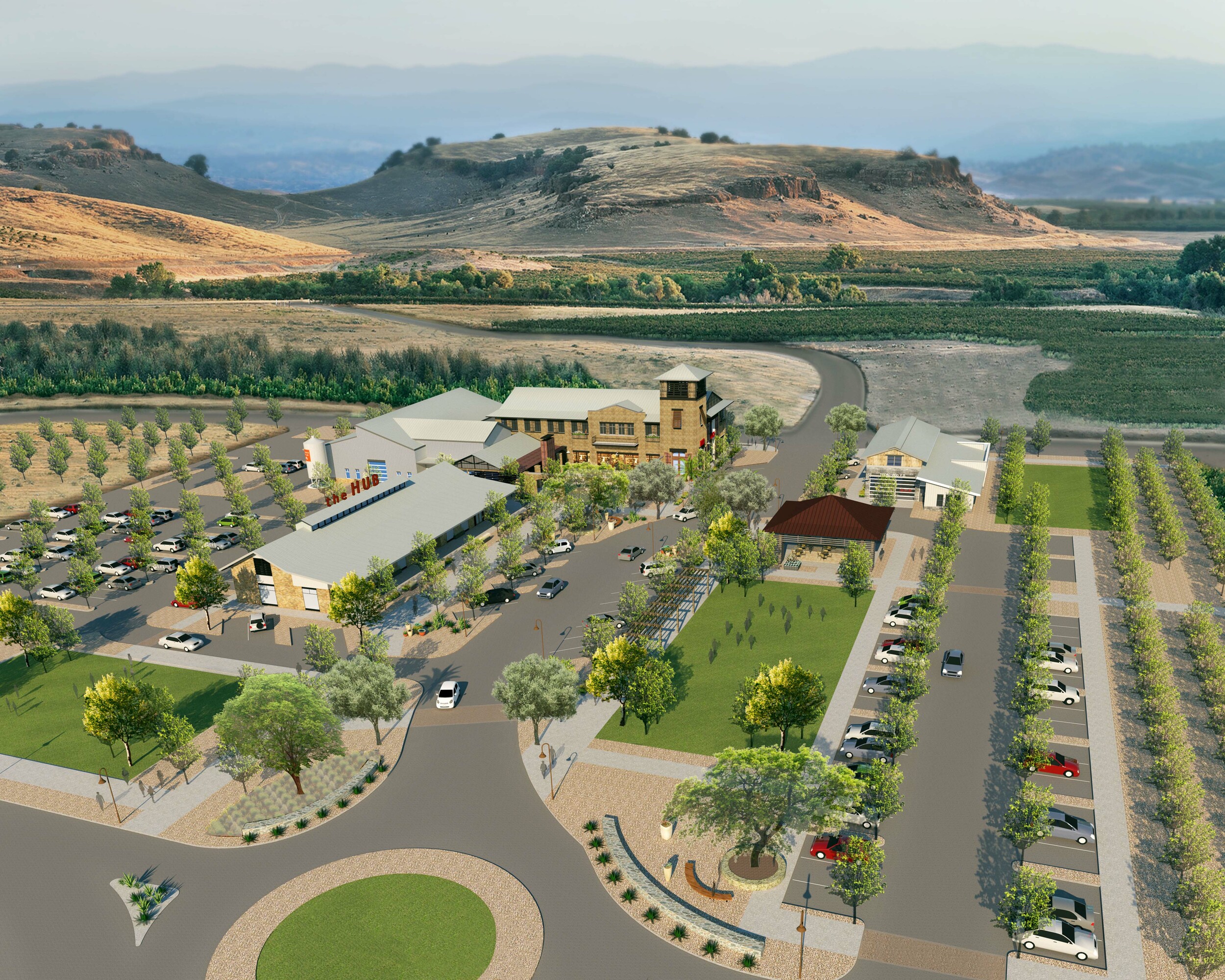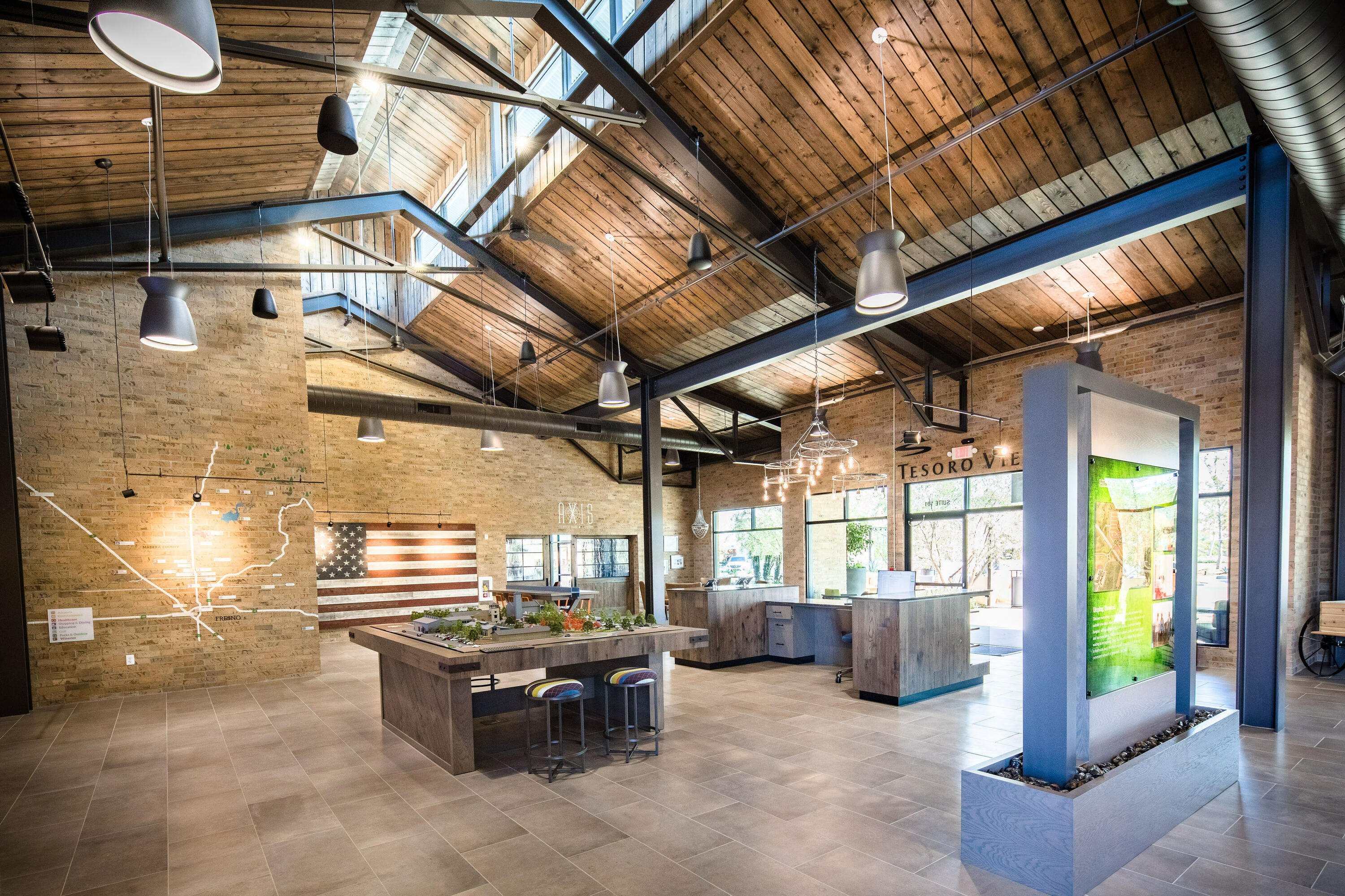 The Hub, the Axis Coffee Shop and Eatery and a Madera County Fire Station form part of the first phase of the town center of this new family-oriented master-planned community. Inspired by the rich agricultural tradition of the region, the building design is based on an imagined history of the site as it could have evolved over time, from a simple farmstead to a large Hacienda that would have eventually been converted into its present use.  Large roof overhangs create shady and inviting places to sit and enjoy a cup of coffee or a simple breakfast or lunch.  The Hub also acts as the Welcome Center for the community, featuring exhibits that illustrate the history of the region and the details of the masterplan, and includes a small office suite.  Inside the building, large exposed metal trusses and a roof skylight reinforce the barn-like feel of the space. The Hub and Axis Coffee Shop and adjacent Fire Station will eventually grow into a multi-block town center that will form the commercial heart and soul of this community.