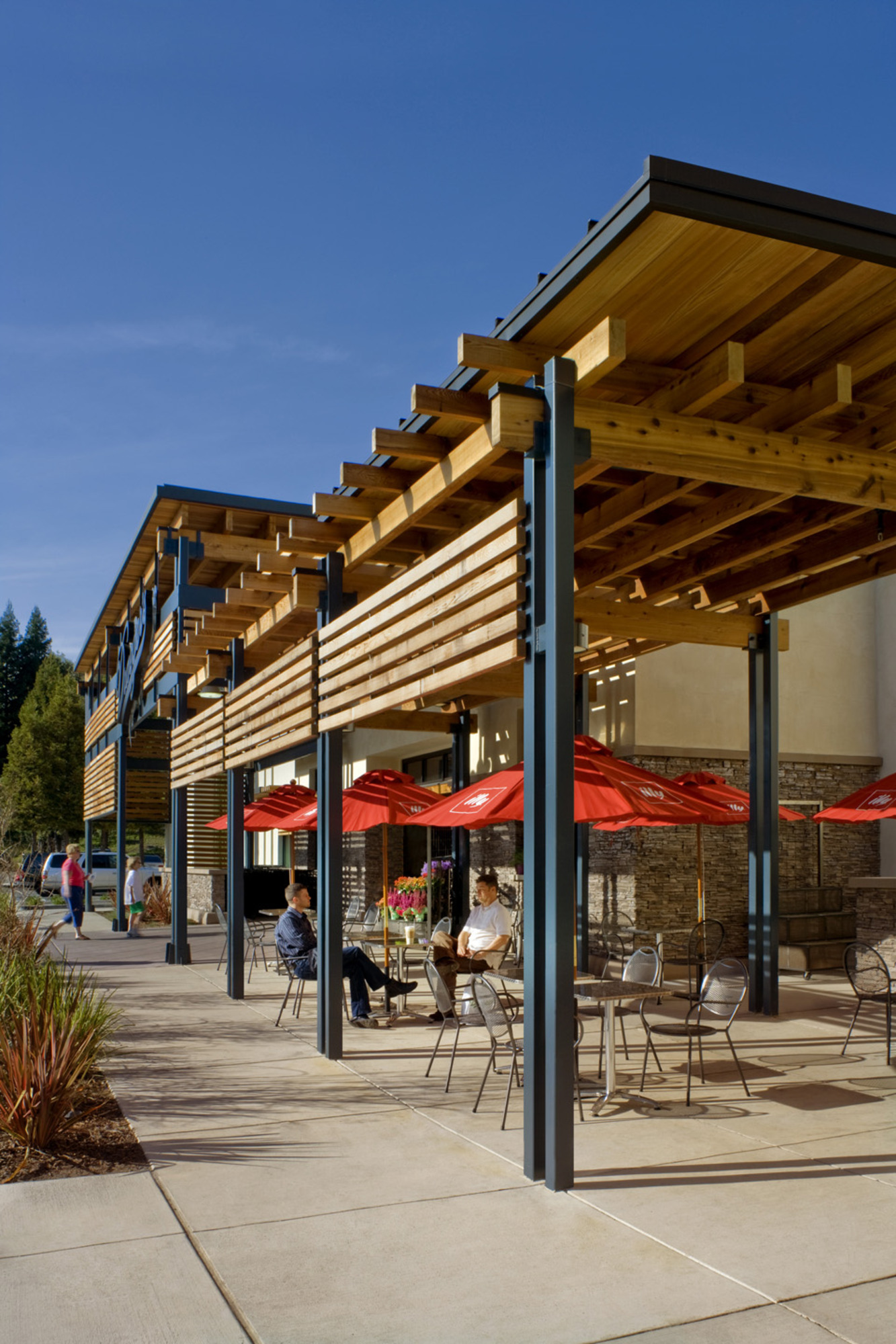 Drought-tolerant native species and stormwater treatment bioswales are used throughout the site. The open-air outdoor market design allows natural ventilation. We also sourced sustainable materials, including reclaimed western red cedar siding made from float logs salvaged in Puget Sound, and structural bricks manufactured locally in Sacramento with clays mined from the Sierra Foothills.