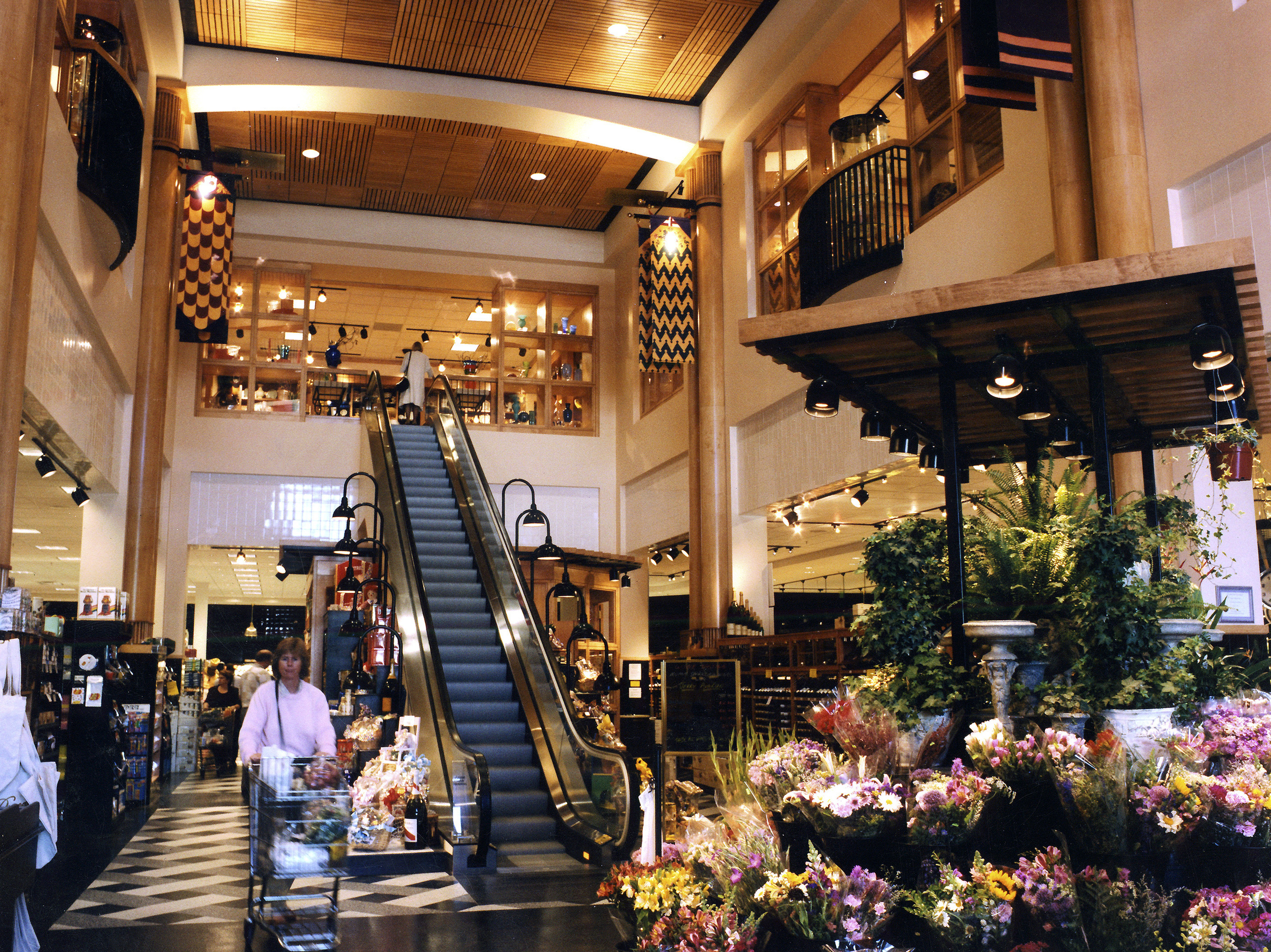 We have a passion for re-inventing the shopping experience and Draeger’s Marketplace offered an opportunity to explore many aspects of the world of fine food. Most of these innovations have since been copied. In the main market you can have coffee and a croissant at an outdoor café, or taste wine in an intimate wine bar under the escalator. If you choose to go up the escalator you are surrounded by the finest cookware from around the world, one of the largest cookbook libraries in the United States and a bridge over the atrium which leads to a cooking school featuring classes taught by world-renown chefs and a formal restaurant where the cooks pick out the finest ingredients each day from the Market below.
